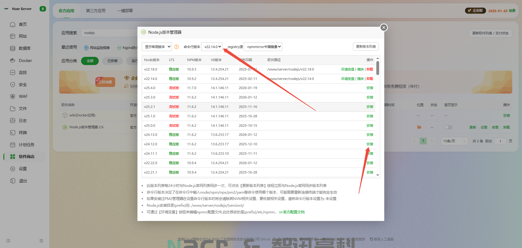 2. 安装完成后,安装nodejs版本,最好选择22或者24