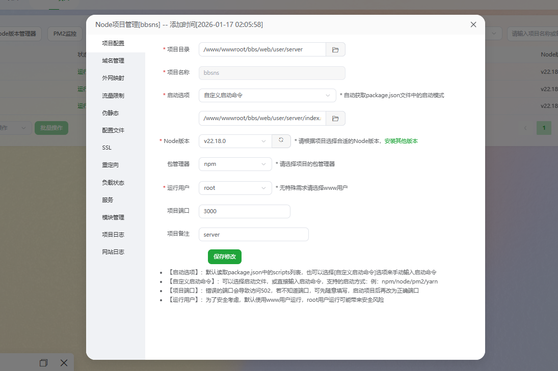 a. 部署后端,如图所示进行配置,注意:如果启动失败,可以将www改为root